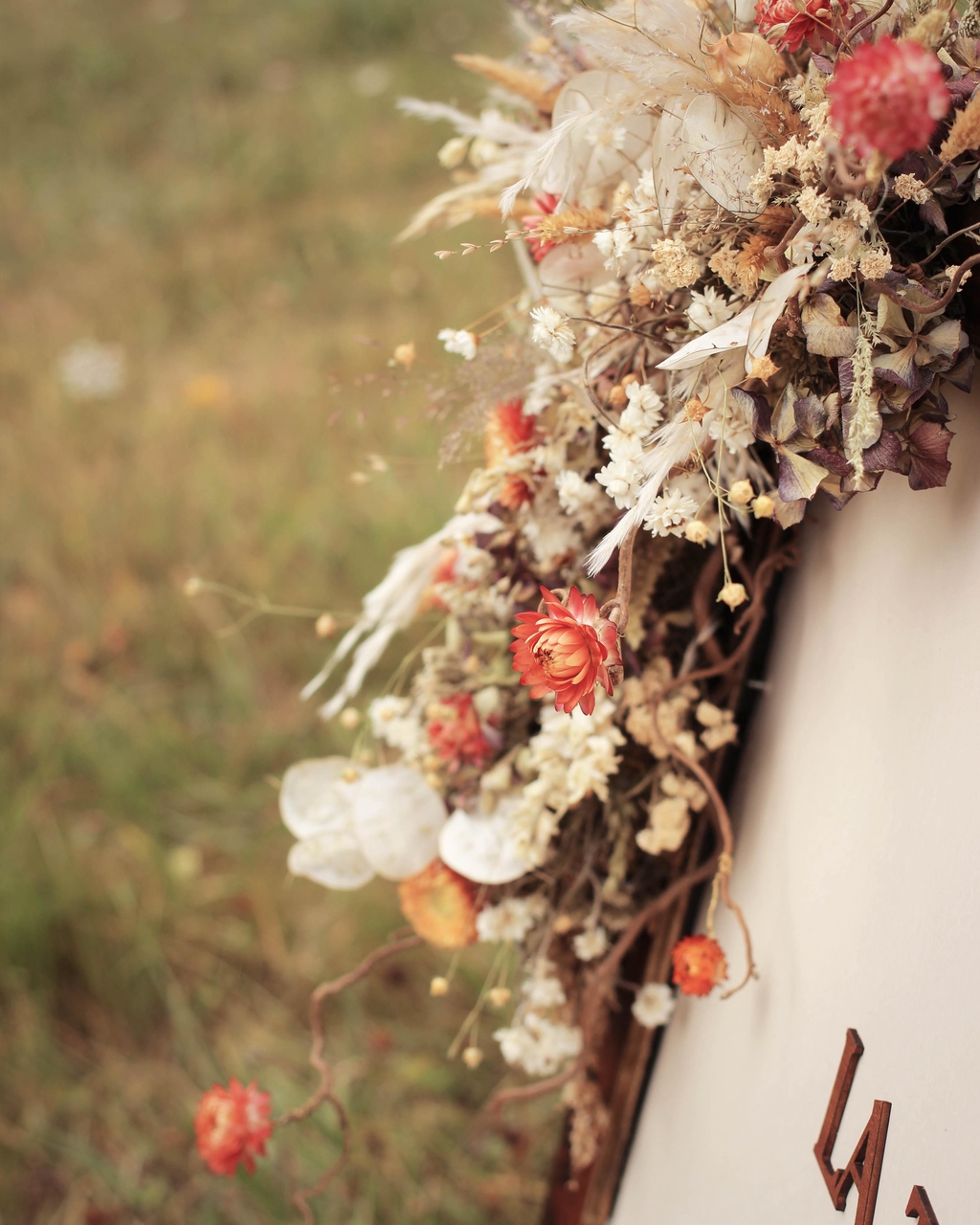 - Couronne Murale : Un tableau vivant de fleurs séchées qui habille vos murs avec sophistication et caractère.